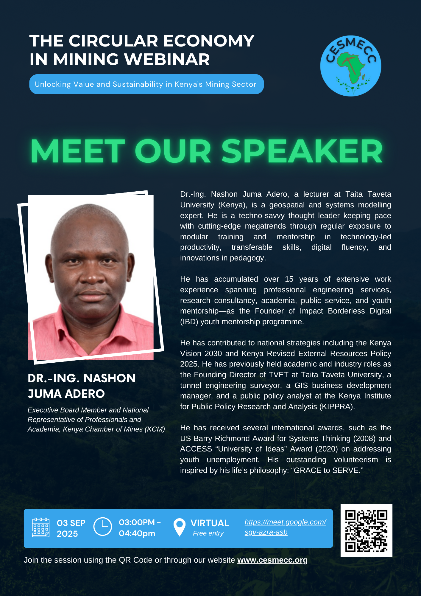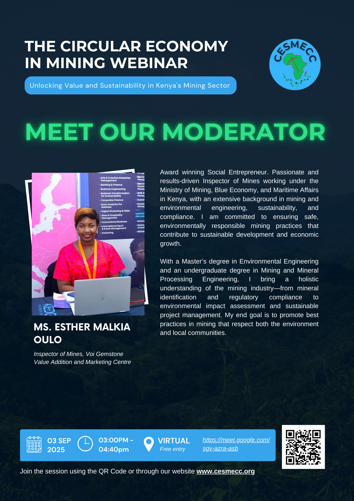 This webinar is timely and critical for CESMECC to champion sustainable development within Kenya’s budding mining sector. By bringing together diverse stakeholders to discuss innovation, best practices, and policy frameworks, this webinar will contribute significantly to shifting the paradigm towards a more responsible and economically viable mining industry in Kenya.