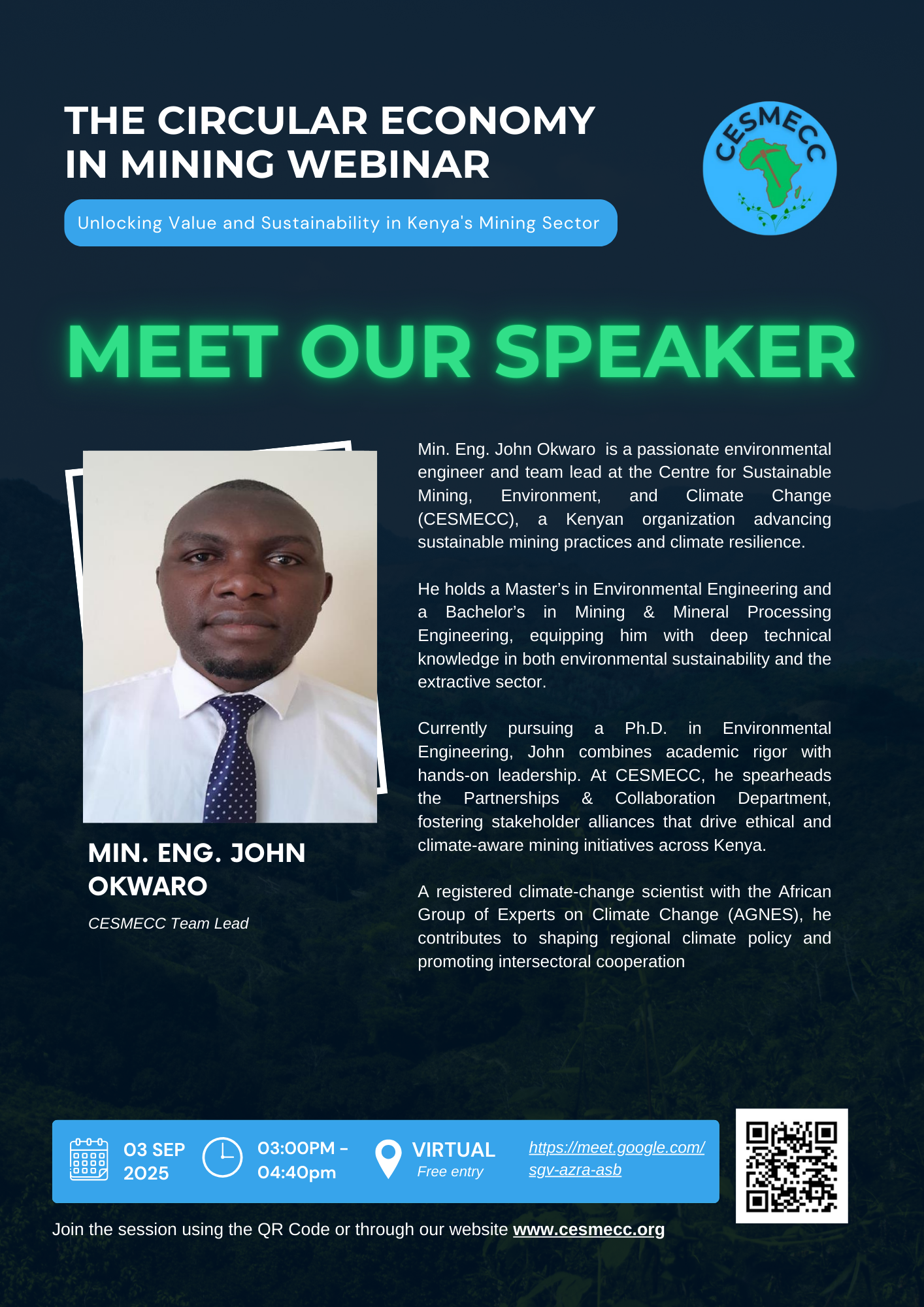 - 1500 – 1505 HRS: Welcome Remarks & Introduction to CESMECC and the Webinar Theme – John Okwaro Team Lead, CESMECC